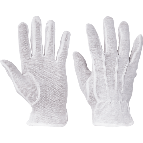 Rukavice šité z bavlneného úpletu, s PVC terčíkmi v dlani a na prstoch, pružinkou na hornej časti zápästia, bez manžety.