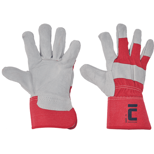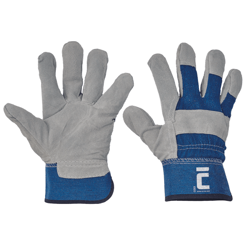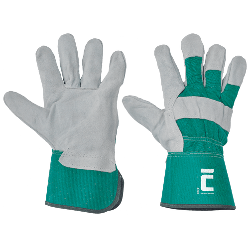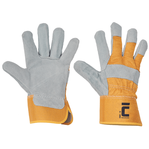 Rukavice z hovädzej štiepenky v dlani s podšívkou, bavlnená tkanina na chrbte, s vystuženou manžetou, celokoženými palcami a ukazovákmi a prekrytými špičkami prstov.